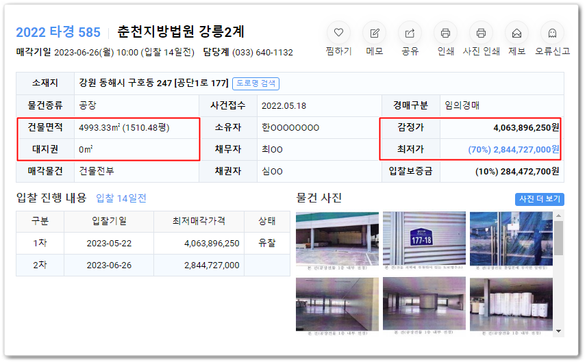 동해공장경매의 사건번호 2022 타경 585입니다.