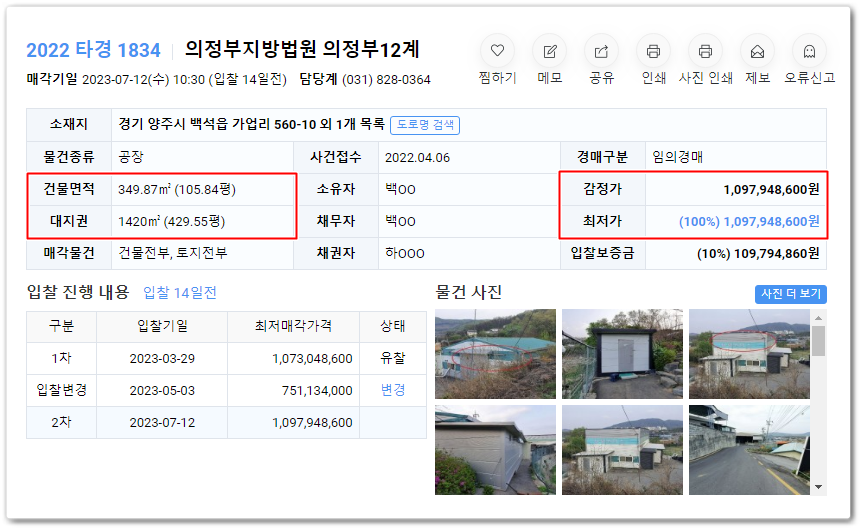 양주시공장경매의 사건번호 2022 타경 1834 입니다 .