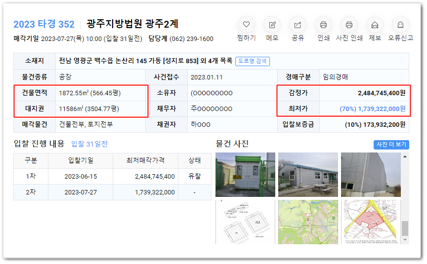 전남공장경매의 사건번호 2023 타경 352입니다.