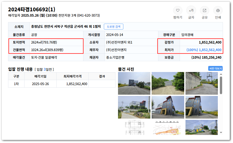 천안시공장경매 충남 천안시 서북구 공장경매전문 2024 타경 106692(1)