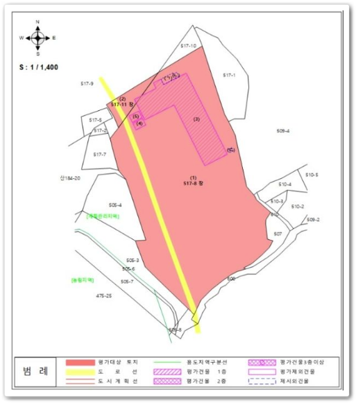 일련번호(1,2): 일단의 사다리형 평지로서, 현황 "공업용 건부지" 및 "도로 등"으로 이용 중임