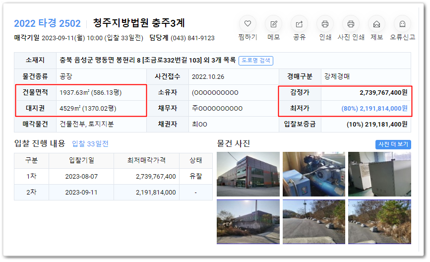 충북공장경매의 사건번호 2022 타경 2502입니다.