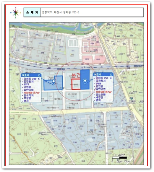 충북공장경매의 위치는 충청북도 제천시 강제동 소재 "강저테크노빌농공단지" 내에 위치하고 있는 공업용 부동산이며, 주위는 농공단지의 중소규모 공장, 창고시설, 나지 등으로 형성된 지역으로서 공업 용부동산으로서의 주위환경은 보통입니다.