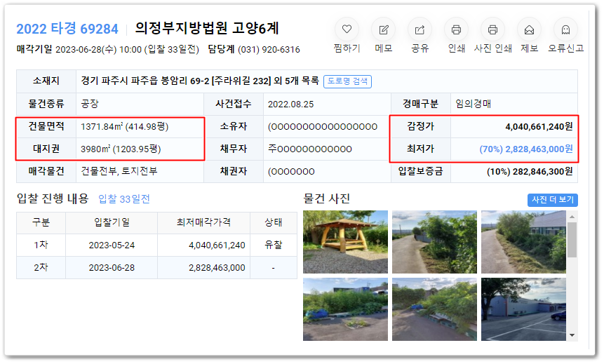 파주식품공장경매의 사건번호 2022 타경 69284입니다.입니다.