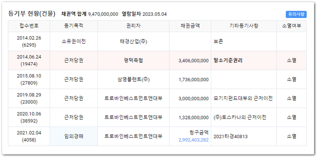 2014년 태건산업에서 보존등기 하였고, 말소기준권리는 평택축협이며 경매신청은 트로바인베스트먼트앤대부에서 하였습니다.