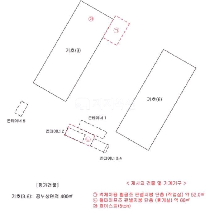 기계기구 1식,컨테이너5동, 천막건물,호이스트등이 있습니다.
