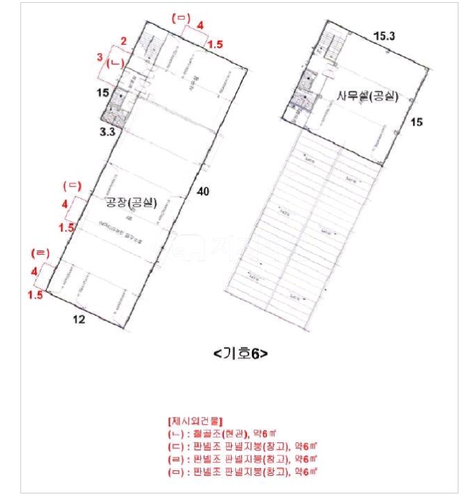 바닥면적 53평의 2층 공장사무실등으로 사용되는 2개의 동으로 이루어져 있습니다.