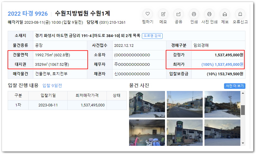 화성공장경매 사건번호 2022 타경 9926입니다.