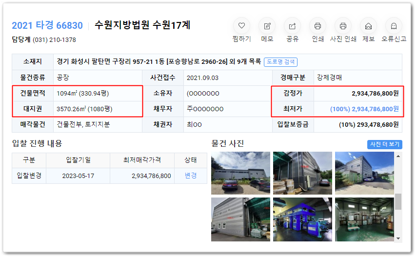 화성시공장경매의 사건번호 2021 타경 66830 입니다 .