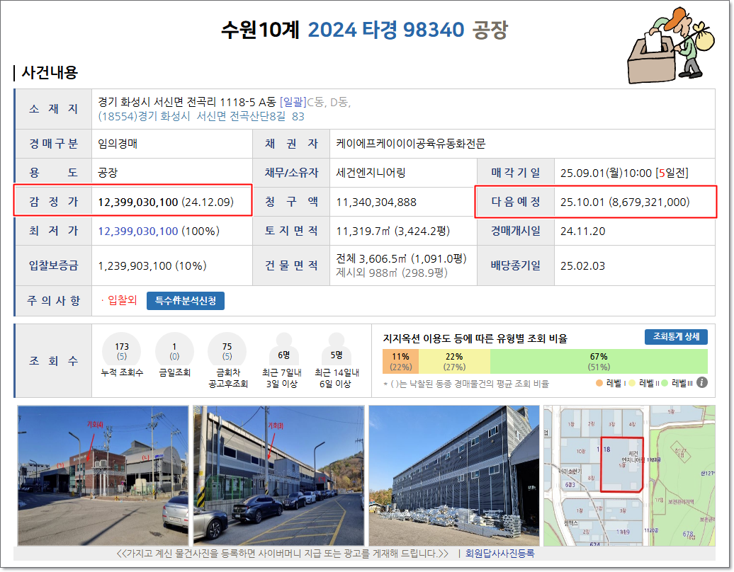 - 구성: 토지 11,319.7㎡(약 3,426평), 건물 2,618.46㎡(약 792평), 제시 외 건물 988㎡, 기계기구 8기