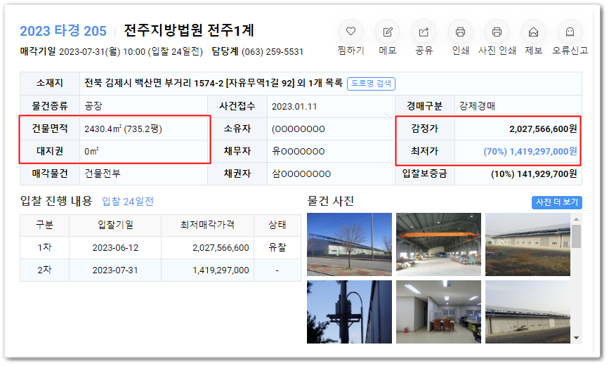 전북공장경매의 사건번호 2023 타경 205입니다.
