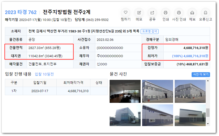 전북공장경매의 사건번호 2023 타경 762입니다.
