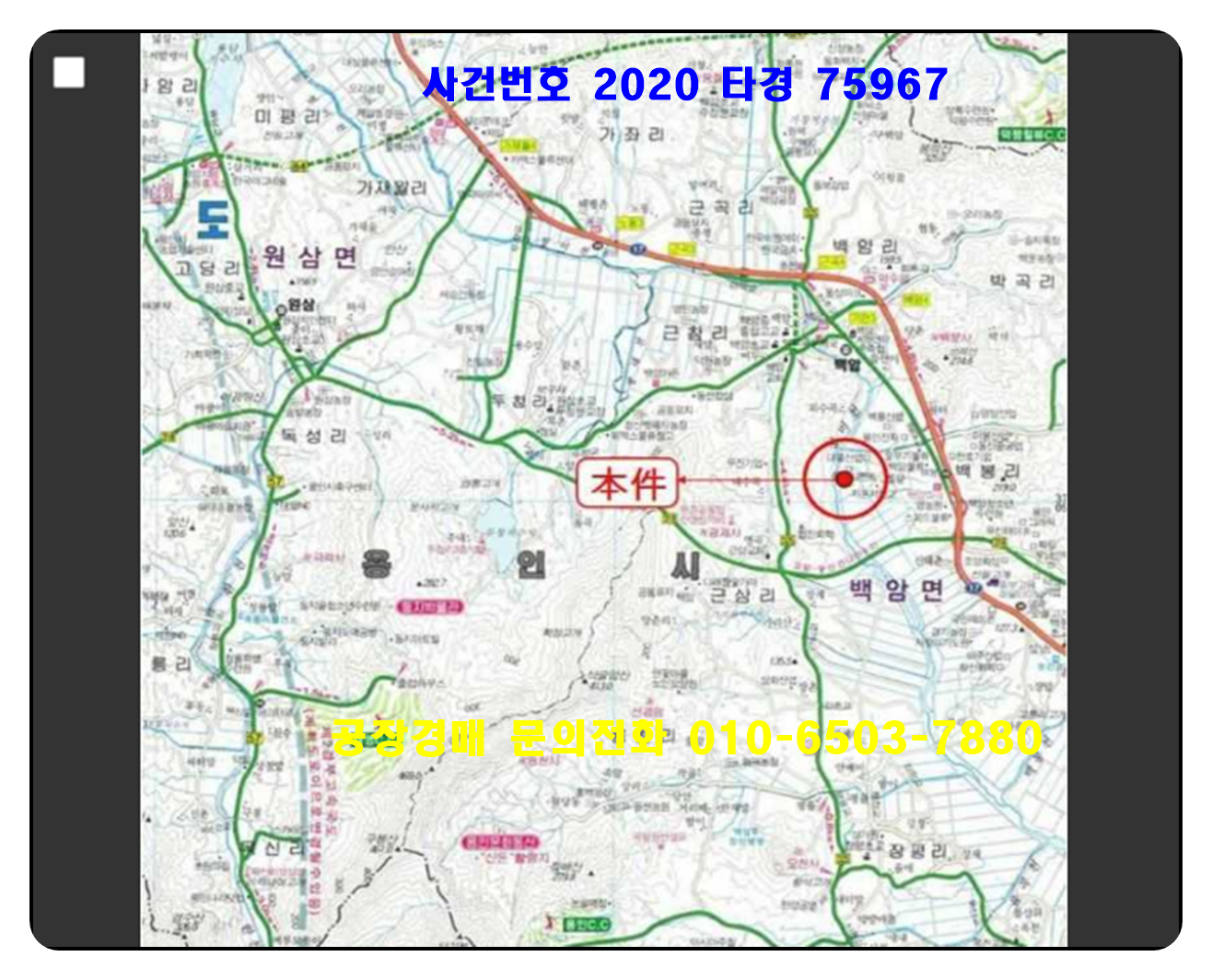 처인구공장경매의 주소지는 경기도 용인시 처인구 백암면 백봉리 소재 "평촌마을회관" 북서측 인근에 위치하며 인근은 공장 및 농경지 등이 소재하는 지역임.