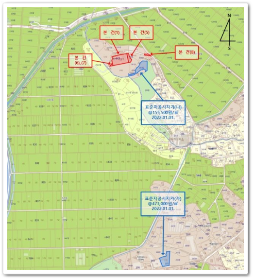 기호(1)는 북동 측으로 노폭 약 4m 내외의 포장도로에 접함. 기호(5)는 지적도상 맹지이나 연접한 토지를 통해 출입가능함. 기호(6)는 지적도상 맹지이나 연접한 토지를 통해 출입가능함. 기호(7)는 지적도상 맹지이나 연접한 토지를 통해 출입가능함. 기호(8)는 노폭 약 4m 내외의 포장도로임.