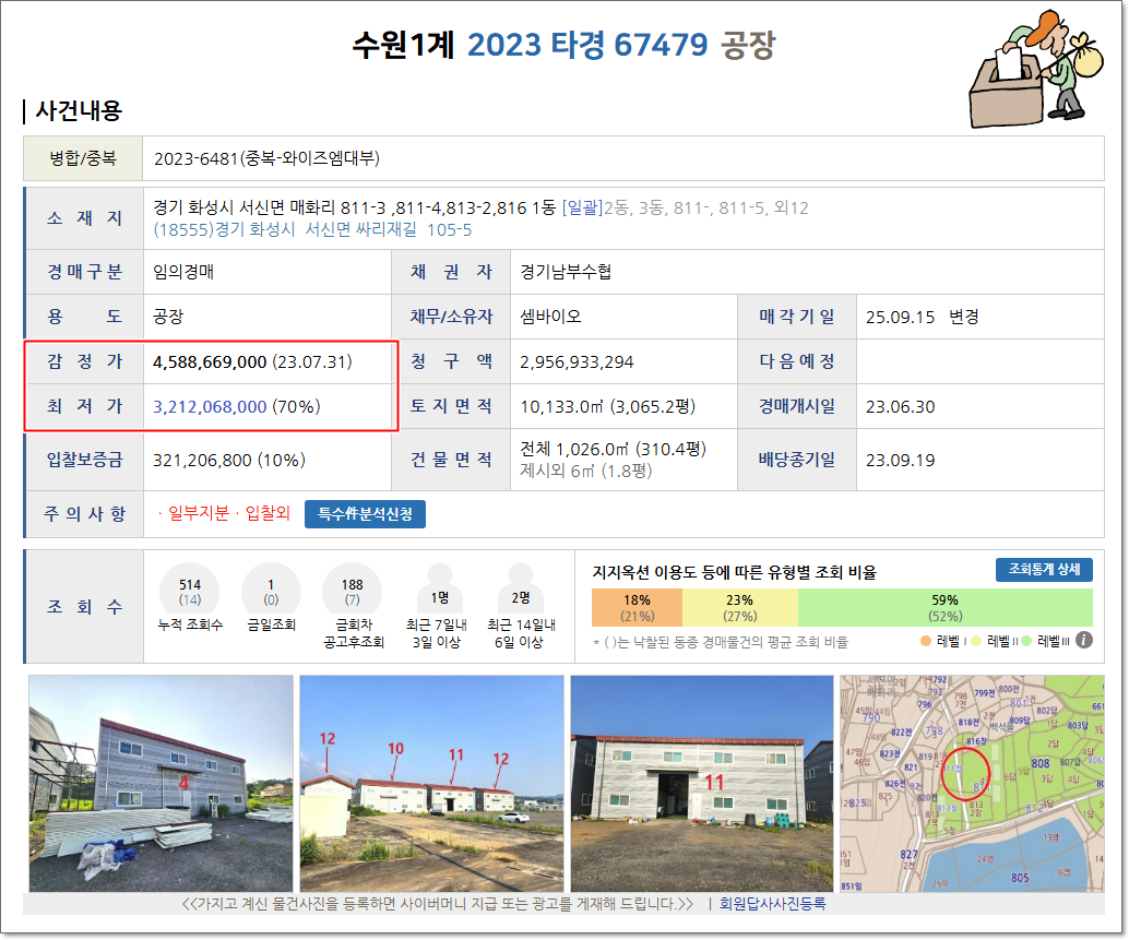 오늘은 경기도 화성시 서신면 매화리에 위치한 공장 경매 물건을 살펴보겠습니다. 이번 사건은 2023타경67479 사건으로, 소유자는 주식회사 셈바이오이며 수원지방법원에서 경매가 진행됩니다. 감정평가액은 45억 7천여만 원으로 산정되었으며, 토지와 건물, 제시외 건물을 포함한 종합적인 평가가 이뤄졌습니다.