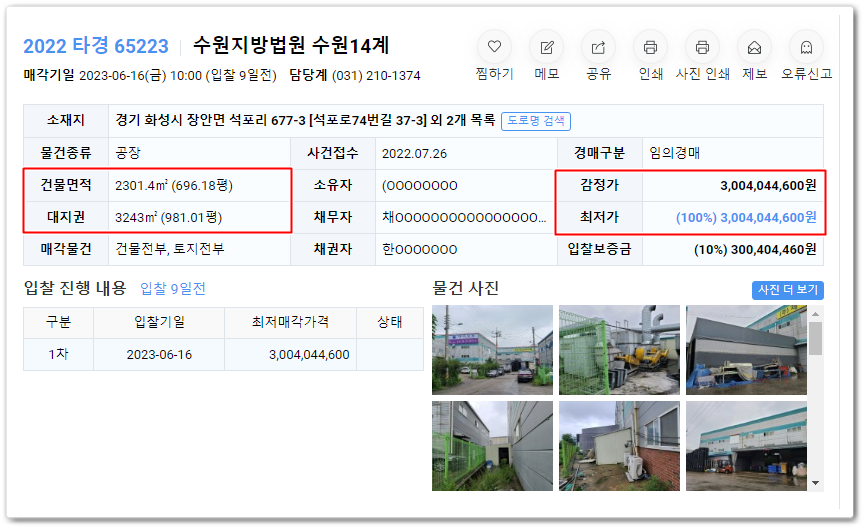 화성시공장경매의 사건번호 2022 타경 65223입니다.